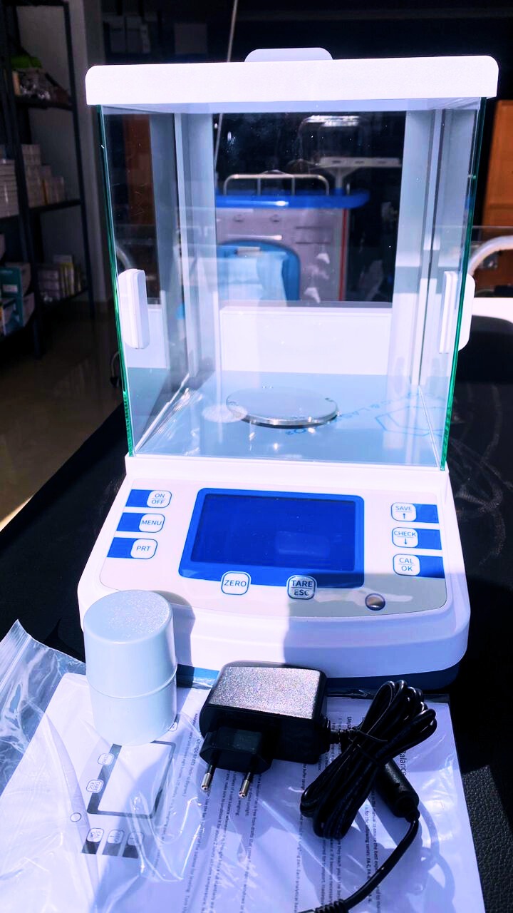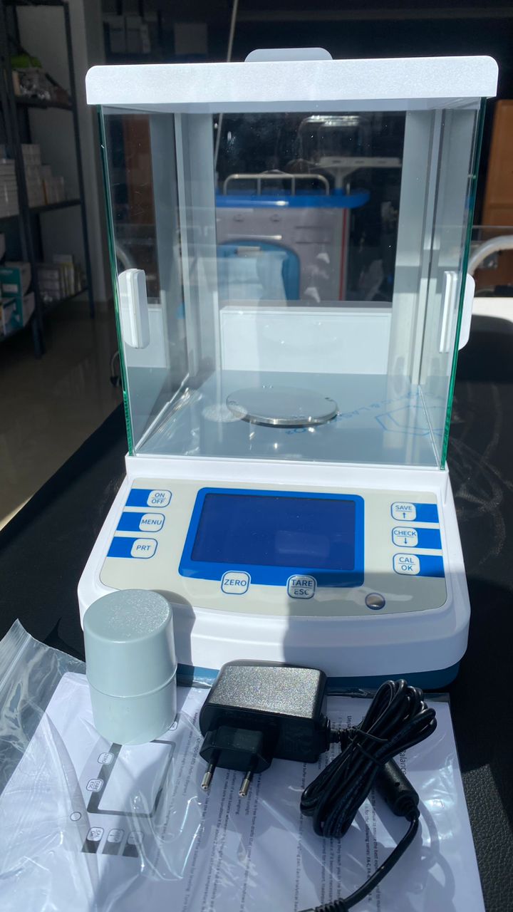 Cette balance de précision électronique est un instrument de laboratoire essentiel pour les mesures de masse extrêmement précises. L’appareil est caractérisé par une enceinte de protection vitrée (appelée cage de pesée) qui isole le plateau de la circulation de l’air, minimisant ainsi les perturbations sur la mesure. Le panneau de commande comprend des boutons de fonction pour la mise en marche/arrêt, le menu, l’impression, ainsi que des touches cruciales comme la tare (TARA) et la mise à zéro (ZERO). Elle est dotée d’un écran d’affichage numérique rétroéclairé pour une lecture claire des résultats, et elle est utilisée dans les laboratoires de recherche et d’analyse où la précision au milligramme est requise.